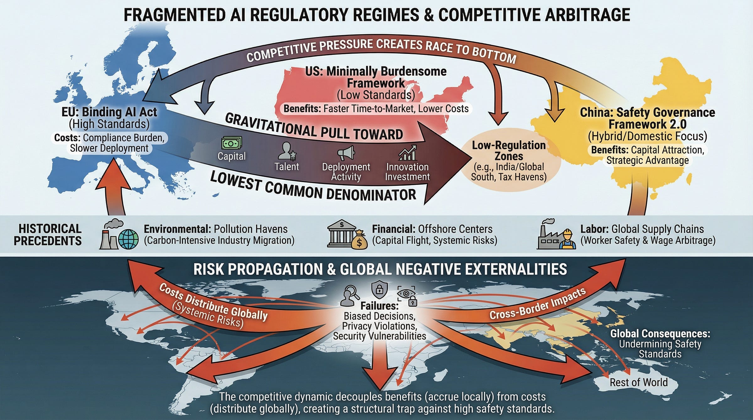 > _Mechanism of regulatory arbitrage in fragmented AI governance showing how competitive pressure creates gravitational pull toward lowest common denominator safety standards._