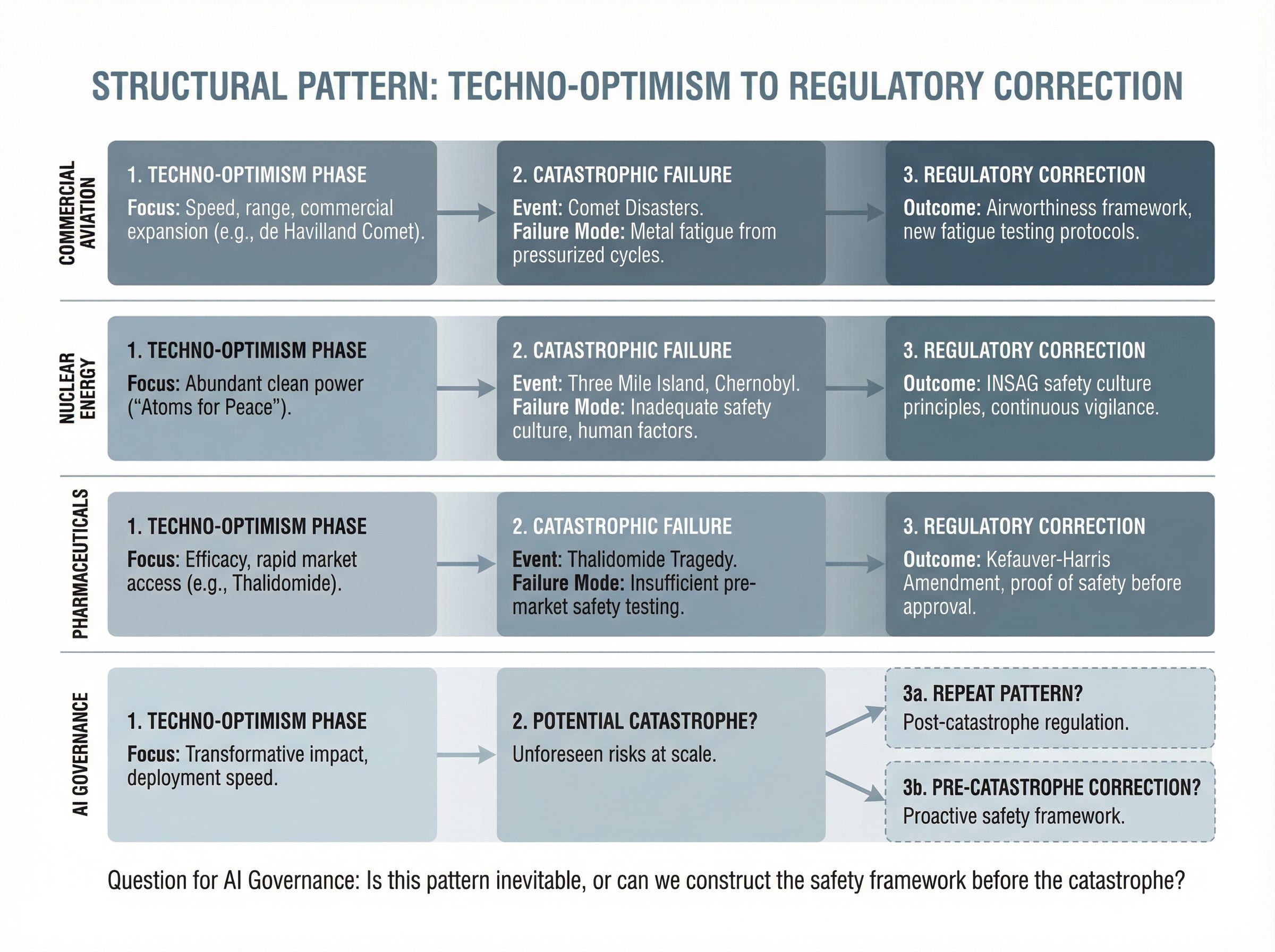 The structural pattern is consistent across these cases, even as the specific failure modes differ: engineering deficiency in aviation, operational culture in nuclear, regulatory capture in pharmaceuticals. First, techno-optimism. Impact narratives push safety to the margins. Then a catastrophe reveals the gap between safety rhetoric and safety practice. Then comes a reckoning that makes safety non-negotiable.