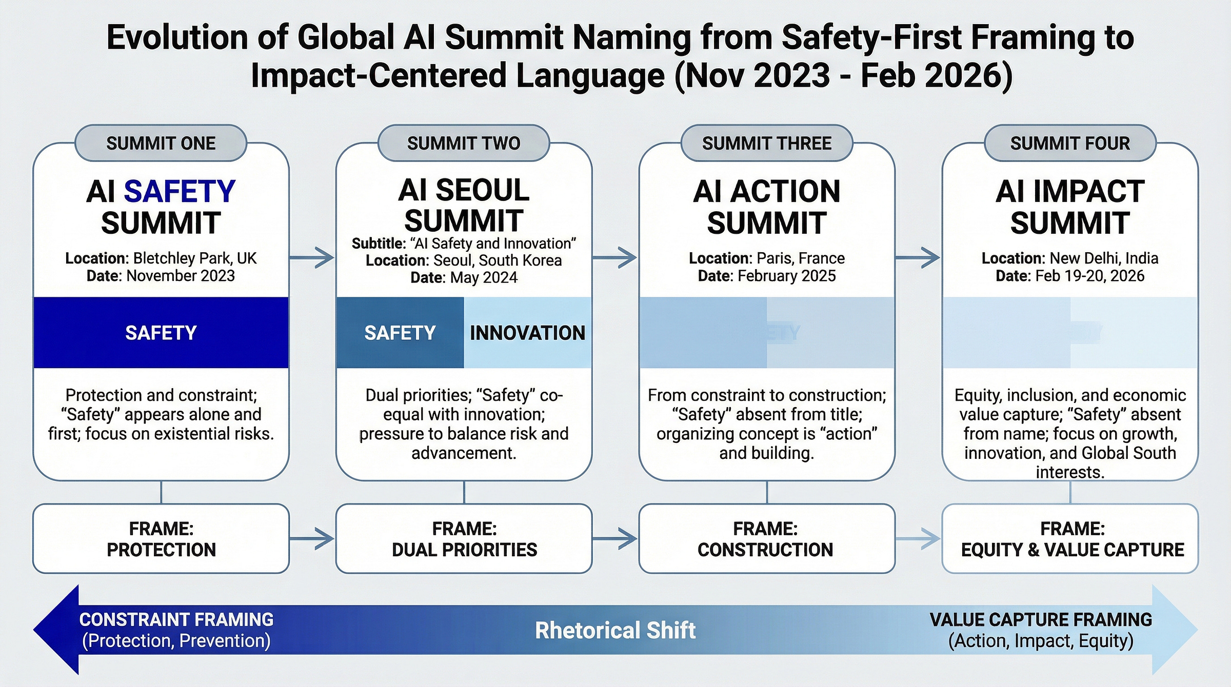 May 2024, Seoul: the AI Seoul Summit. The subtitle: “AI Safety and Innovation.” Safety still present, but sharing the marquee. Innovation had arrived as a co-equal concern.