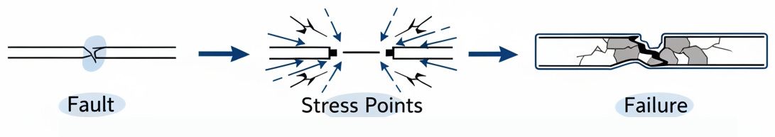 * **Fault vs. Failure (Safety Engineering)** : The essay borrows from safety-critical systems terminology (ISO 26262, DO-178C). A fault is an abnormal condition (a latent defect), while a failure is the observable malfunction. Faults cause errors; errors cause failures. The analogy: the fault is organizational (no secure tools), the failure is operational (data leak).